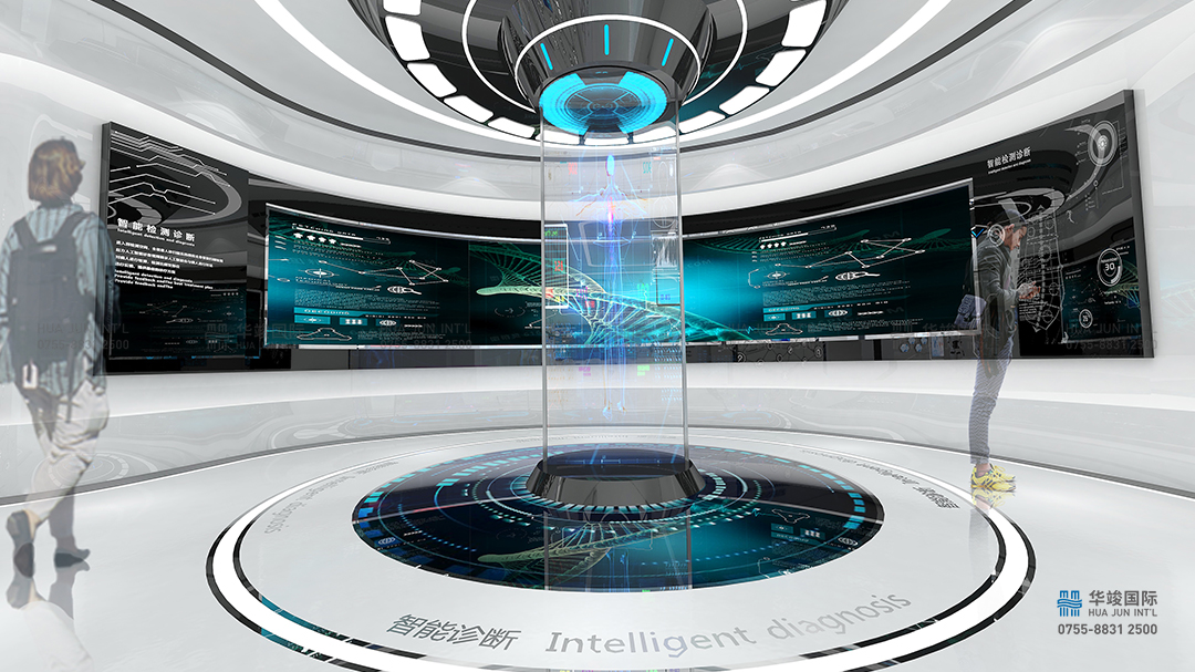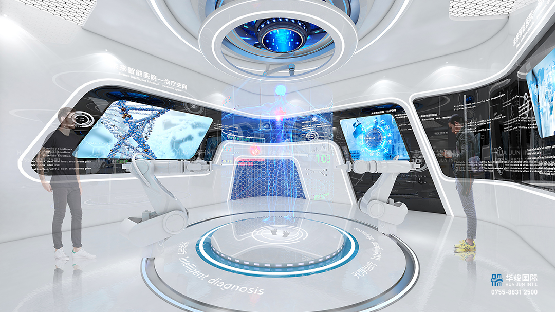 鄭州黃河科技學院智慧醫療體驗廳項目由華竣數創執行整體設計施工,華竣數創擁有頂級展館設計團隊和國際化的創新設計理念,融合互聯網+思維,順應科技化趨勢,打造全新智慧多媒體展廳。