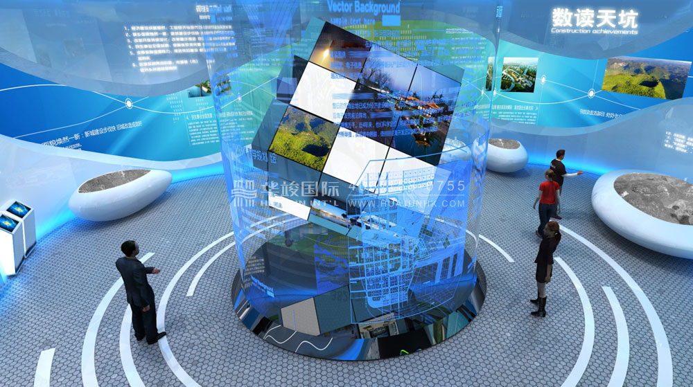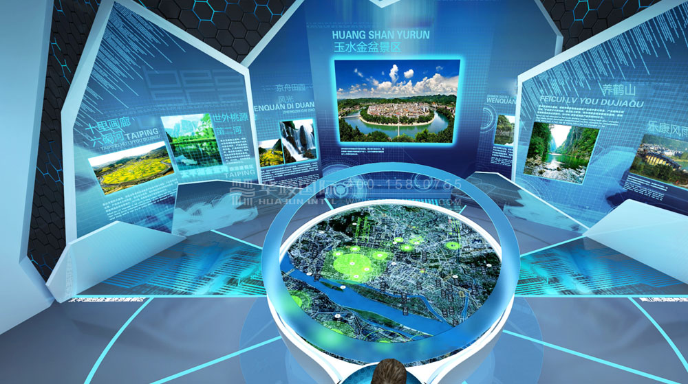 該展廳設計以“中國天眼”為設計靈感,用天眼(天坑)的科幻模擬造型,結(jié)合樓體外觀,整體打造“開眼看世界”的印象格局。利用磁懸浮技術(shù),設置多個球幕,在空中懸浮上升、下降,讓游客體驗天體運動場景,各球幕呈現(xiàn)當?shù)卮硇跃坝^。并通過虛擬導游的方式,游客可具體了解本地各個景區(qū)的信息,合理規(guī)劃旅游行程安排。還以交通規(guī)劃切入,按動觸控屏,即可點亮河流帶,實現(xiàn)實時交通交互;可查詢到周邊的交通規(guī)劃,吃、住、行、游、購、娛旅游產(chǎn)業(yè)鏈等。