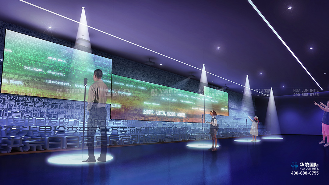 以開卷形式的背墻效果,打造漢字六書的效果,中間以藍(lán)色燈光效果的光柱為主要形式,將第一展廳的名稱放置在中間。頂部的方柱頂上將二維碼的內(nèi)容植入進(jìn)來,觀眾通過掃碼了解相關(guān)漢字六書的知識點。